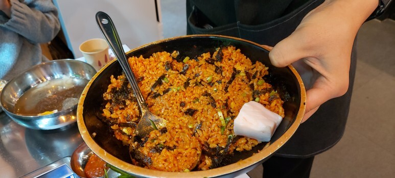 밥을 볶아주시고 가운데 계란을 놓습니다