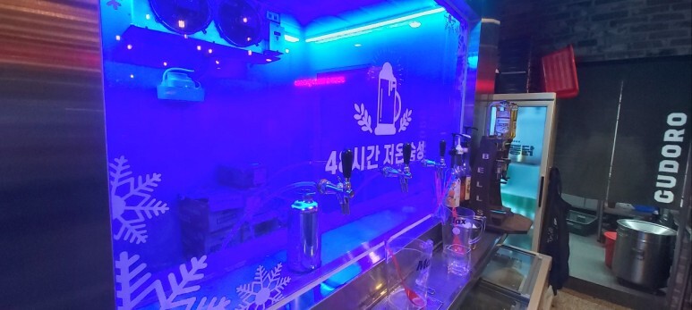 매장 중앙에는 파란색으로 빛나는 맥주저장고가 있습니다.