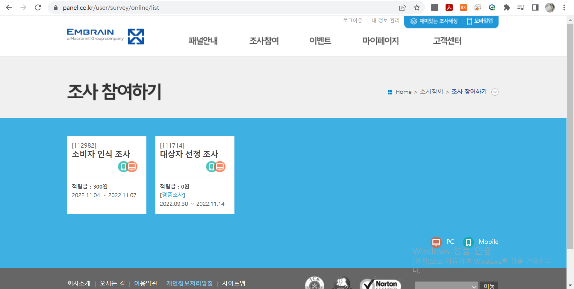 참여하실 수 있는 설문조사 목록이 나옵니다