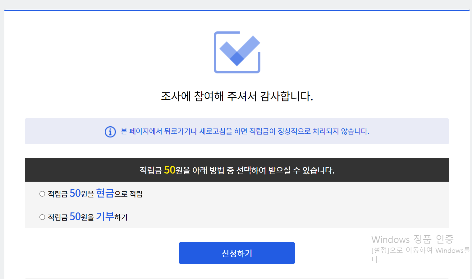 적립금 신청 후 적립금 확인하기를 누르시거나